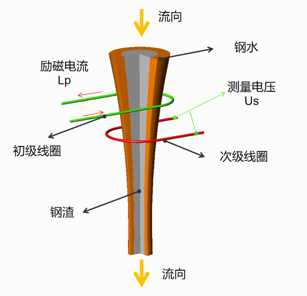 传感器采用电磁感应原理,其结构是圆形,内有是两同心线圈。当初级线圈通以中低频激磁电流时, 由于磁场作用,在钢流中产生涡流,其磁场方向与线圈产生的磁场方向相反。因为钢渣的电导率在高温情况下远低于钢液的电导率(约1/1000),所以在钢渣中产生的涡流远小于钢液中产生的涡流。在浇钢过程中,开始浇注时流出的全部为钢水,到浇钢后期,钢渣混出,使溶体电导率下降,电磁场将有所增强,此信号由次级线圈测得。以此来获得钢包下渣信号,对下渣过程进行预报的检测方法。
